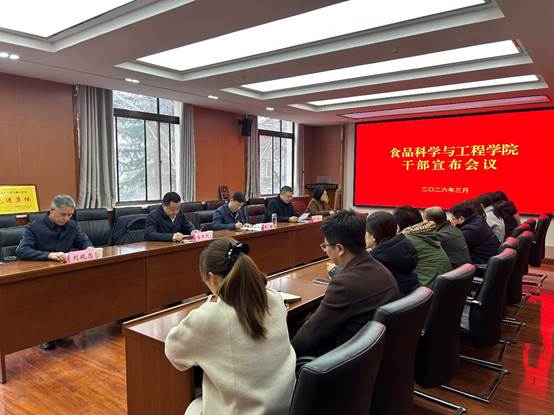 3月2日下午,食品学院干部宣布会议在太白校区举行。校党委书记蒋林,校党委组织部常务副部长周超出席会议,学院党政班子成员、科级干部和教师代表参加会议。会议由学院院长岳田利主持。