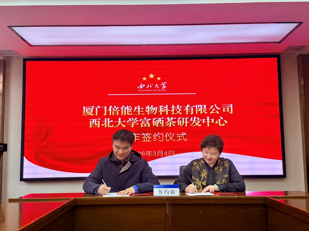 2026年3月4日,厦门倍能生物科技有限公司与西北大学富硒茶研发中心合作签约仪式在西北大学食品科学与工程学院顺利举行。厦门倍能生物科技有限公司创始人蔡福带、西北大学富硒茶研发中心主任袁亚宏教授及团队骨干共同出席活动。双方围绕功能食品研发、营养健康产品创新及科技成果转化等领域达成全面合作,开启校企协同创新、科技赋能产业升级的新征程。