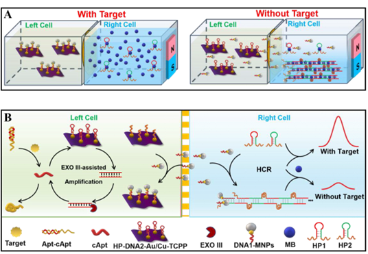 基于此,本研究设计了一种新型AFB1检测系统,该系统包含有识别池和检测池两个部分,并用阳极氧化铝纳米通道将识别池和检测池隔开。识别池中含有尺寸较大、无法通过纳米通道的MOF-DNA纳米结构和尺寸较小可通过纳米通道的磁流体,检测池中含有亚甲基蓝和发卡DNA结构。当AFB1不存在时,在磁力控制下,游离的磁流体从识别池迁移至检测池,引发检测池发卡结构DNA链式杂化扩增,固载亚甲基蓝,降低其电化学信号;当AFB1存在时,识别池中DNA适配体先有效识别AFB1,在核酸外切酶辅助下引发磁流体循环固载于MOF表面,减少检测池中发卡DNA链式杂化扩增,增强了检测池亚甲基蓝的电化学信号。该设计通过磁力控制和纳米通道位阻,实现样品识别和检测分离,有效降低背景干扰,而且在识别和检测过程中引入了双重DNA信号扩增技术,有效提升了灵敏度。该传感方法检测AFB1线性范围宽至10−5-102 pg/mL,检出限低至4 × 10−6 pg/mL,展现出优异的重现性、稳定性和选择性,且测定结果与国标方法(高效液相色谱法)相符,可实现花生样品中微量AFB1的高效测定。