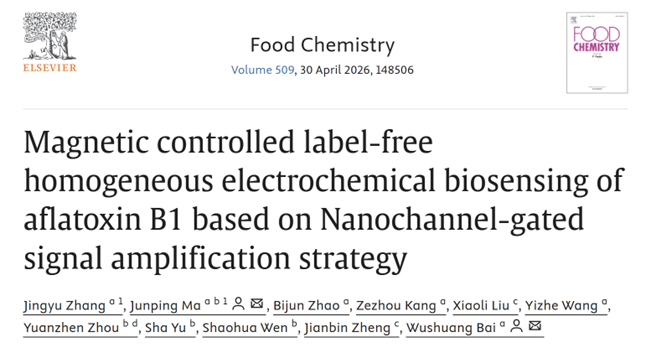 近日,我院白武双副教授课题组在国际食品Top期刊《Food Chemistry》(中科院1区,IF: 9.8)发表题为“Magnetic controlled label-free homogeneous electrochemical biosensing of aflatoxin B1 based on Nanochannel-gated signal amplification strategy”的研究型论文。我院在读硕士研究生张靖瑜为第一作者,通讯作者为我院副教授白武双和博士研究生马军平(已毕业,现为西安建筑科技大学准聘副教授)。