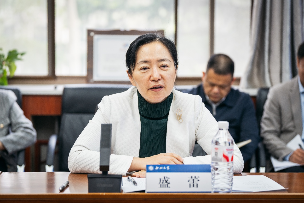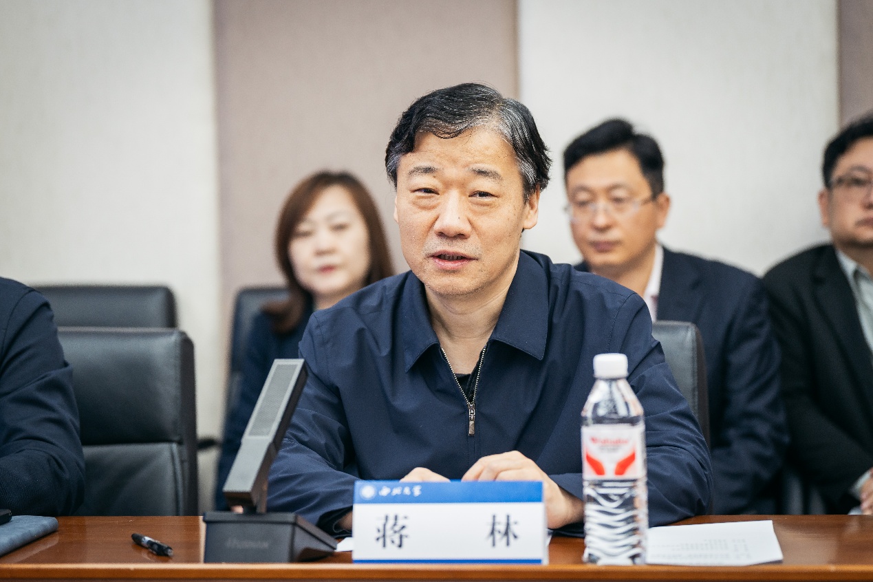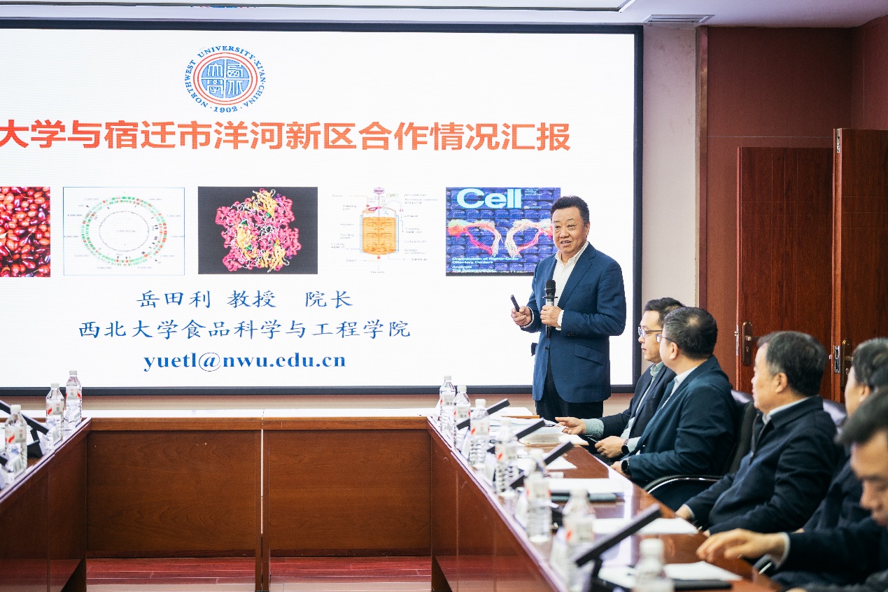 会上,蒋林代表学校对盛蕾一行莅临考察表示热烈欢迎。他介绍,西北大学作为国家“双一流”“211工程”建设高校,办学底蕴深厚、学科实力突出,食品科学与工程学院聚焦食品产业前沿与地方需求,在白酒酿造、食品安全管控、食品微生态健康等领域积累了雄厚科研实力与丰富产学研经验。当前学校正全面推进 “一院一地一产一企” 行动,推动创新链、产业链、人才链深度融合。他表示,学校愿以此次会议为契机,与宿迁市开展全方位战略合作,加快推进洋河研究院实体化运行,为宿迁洋河白酒及绿色食品产业提供全链条科技支撑,助力洋河新区打造世界级健康白酒产业高地。